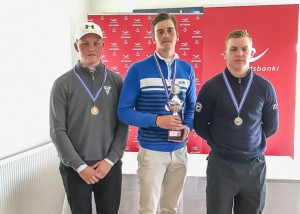 F.v.: Axel Fannar, GL, 3. sæti; sigurvegarinn Egill Ragnar, GKG, Íslandsmeistari í holukeppni í piltaflokki 19-21 árs; Björn Óskar, GM 2. sæti. Mynd: GSÍ