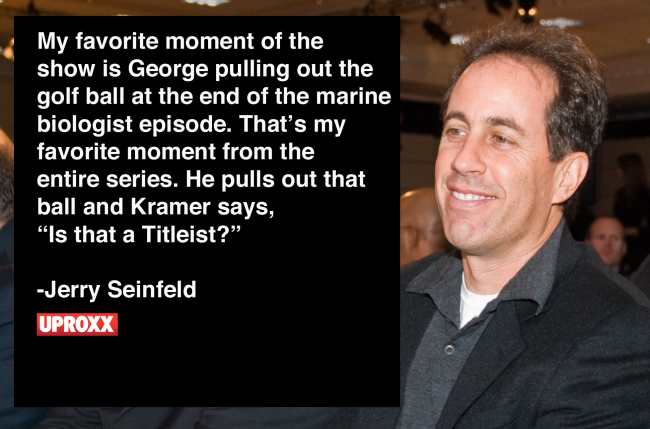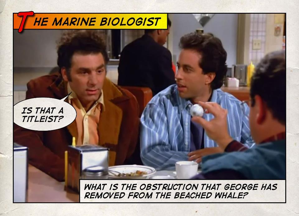 „Í augnablikinu eru 600 Titleistar af æfingasvæðinu í farangursgeymslunni í bílnum mínum!“ Þessi söngur Kramer kemur fram í „The Marine Biologist“ þætti „Seinfeld.“ En þessi skrítni nágranni Jerry verður pirraður þegar hann ætlar að slá þeim í hafið en hittir bara 1! Þá koma eftirfarandi kunnuglegar athugasemdir: „I stink! I can’t play! The ball is just sitting there, Jerry, and I can’t hit it!“) – Atriðið endar með ánægju Kramer þegar hann kemst að því að hann hafi hitt bolta í blástursop hvals („A hole-in-one, eh?“) Spennan – niðurlæging – umbun – Kramer í þessum eina þætti sameinar tilfinningar sem flestir kylfingar þekkja allt of vel! 🙂