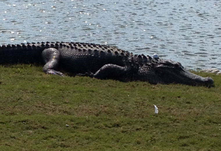 Það gerist auðvitað ekki hér á landi heldur í Flórída, þar sem kylfingar eru meira og minna alltaf að spila golf í námunda við þetta græna skriðdýr.