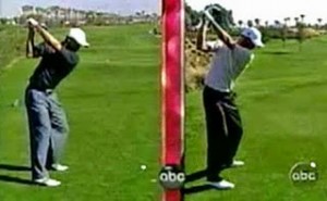 Charles Caleb Colton skrifaði eitt sinn: „Að herma/stæla er einlægasta form skjalls.” (Ens.: „Imitation is the sincerest form of flattery.“) Ef svo er þá hlýtur Tiger að finnast Adam Scott hreint og beint elska sig. Það er kunnara en frá þurfi að segja að Adam Scott var algerlega heillaður af golfsveiflu Tigers og reyndi að stæla hana eins og hann gat. Og hann gerði það svo vel að sveifla hans lítur út eins og kópía af sveiflu Tiger, þar til Tiger fór að rugla hana til fyrir u.þ.b. 10 árum. En ef þið lítið á sveiflu Adams nú er það enn sama sveiflan. Hann er eins og mannleg tímavel sem geymir eðalsveiflu Tigers frá því í kringum árið 2000. Sjáið mynd af baksveiflu Tigers og Adam Scott hér að neðan: