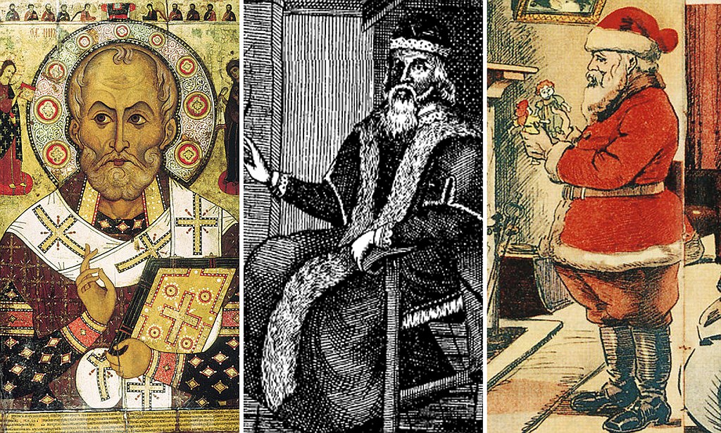Nikulás eftir Lipensky (t.v.), rússneskur ikoni frá árinu 1294. Á ofangreindri mynd sést hvernig íkonin hefur þróast í Santa Claus eða St. Nikulás.