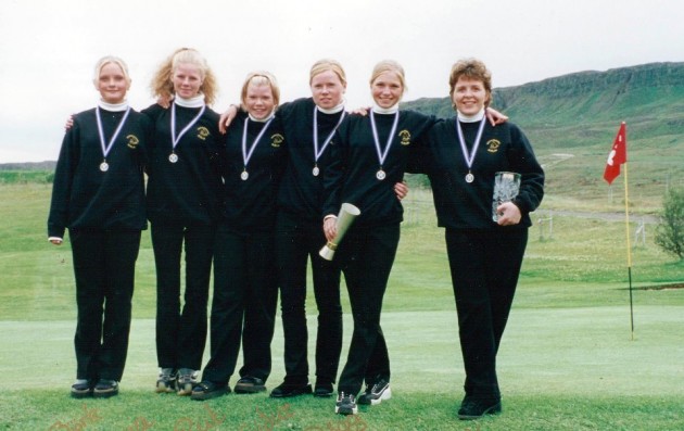 Kvennasveit GKJ – Íslandsmeistarar í sveitakeppni kvenna 1998. F.v.: Nína Björk Geirsdóttir, Eva Ómarsdóttir, Afmæliskylfingurinn okkar Helga Rut Svanbergsdóttir, Snæfríður Magnúsdóttir, Katrín Dögg Hilmarsdóttir og Steinunn Björk Eggertsdóttir. Myndin er tekin 1998 og er í eigu Helgu Rutar.