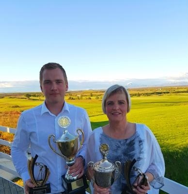 Í aðalmyndaglugga: Katrín ásamt syni sínum Andra Má, þegar þau urðu klúbbmeistarar 2017