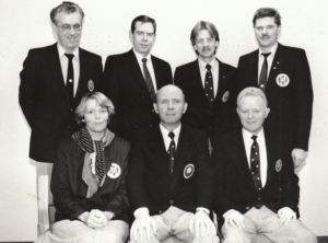 Stjórn GSÍ árið 1985. Efri röð frá vinstri: Frímann Gunnlaugsson framkvæmdastjóri GSÍ, Hannes hall,Ómar Jóhannsson og Guðmundur S. Guðmundsson.