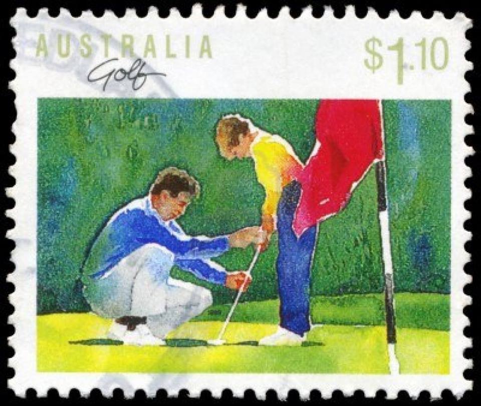 Hér að neðan má sjá fleiri áströlsk golffrímerki og eru golffyrirmyndirnar: golfskór, golfgripið, forsetabikarinn og golfbolti og kylfur: