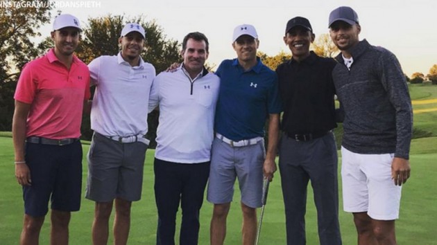 Stórkylfingurinn Jordan Spieth tók golfhring með körfuboltakappanum Stephen Curry og bróður hans Seth og eins fyrrverandi Bandaríkjaforseta, Barack Obama.