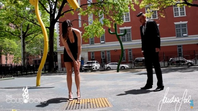 Gal var látin slá brelluhögg í hælaháum skóm og í míníkjól – frekar erfiður útbúnaður, enda sagðist Gal í viðtalinu oft hafa þurft að fara úr hælaháu skónum í ferð sinni um New York.