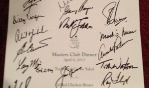 Á matseðlinum hjá Bubba var Ceasar salat í forrétt. Í aðalrétt voru grillaðar kjúklingabringur með kartöflumús, grænum baunum, maís og makkarónum í osti (ens. Macaroni and Cheese) og kornbrauði. Í desert var confetti kaka með vanillu ís. Ekkert var minnst að að vín hafi verið með matnum og kannski að Masters kylfingarnir hafi bara getað pantað að eigin vild.