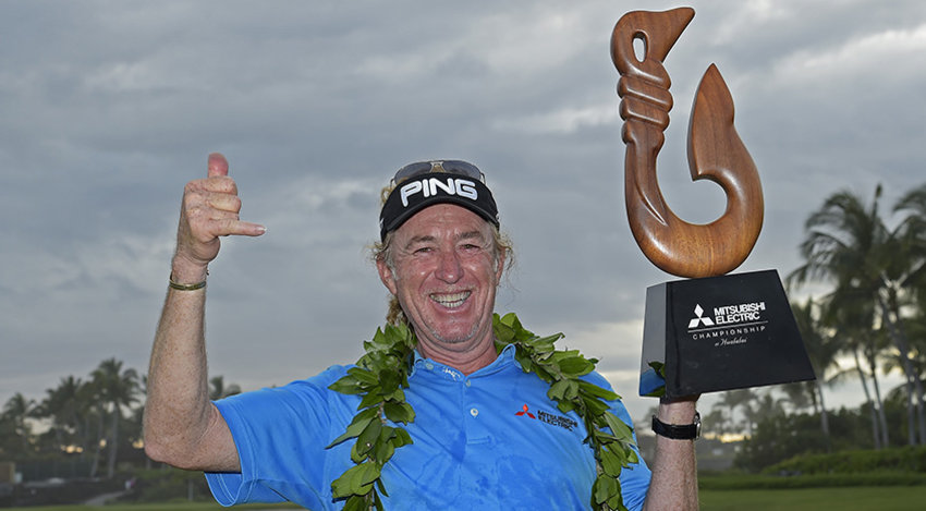 Það var spænski kylfingurinn Miguel Ángel Jiménez, sem sigraði á Mitsubishi Electric Championship, á Hualalai á Hawaii í gær, 25. janúar 2015.
