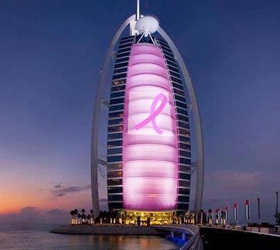 Á hótelinu, sem er eitt það íburðamesta í heimi, var dags bleika borðans minnst en hótelið „klæddist bleiku“ líkt og margir hér á Íslandi í dag.