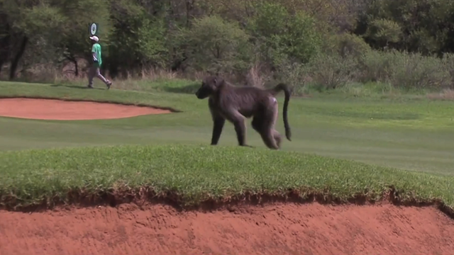 Á 2. hring hljóp api inn á golfbrautina þar sem efsti maður mótsins var upptekinn af að keppa.