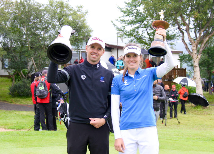 Birgir Leifur Hafþórsson úr GKG og Ólafía Þórunn Kristinsdóttir úr GR fögnuðu sigri á Íslandsmótinu í golfi á Eimskipsmótaröðinni 2016. Mótinu lauk í dag á Jaðarsvelli á Akureyri og var þetta í 75. sinn sem keppt er í karlaflokki og 50. sinn í kvennaflokki. Mikill fjöldi áhorfenda var á Jaðarsvelli á lokahringnum og nýttu sér frábæra þjónustu GA þar sem þráðlaust netsamband var á vellinu og gátu áhorfendur fylgst með beinni útsendingu á RÚV og lifandi skori á golf.is þegar spennan náði hámarki.
