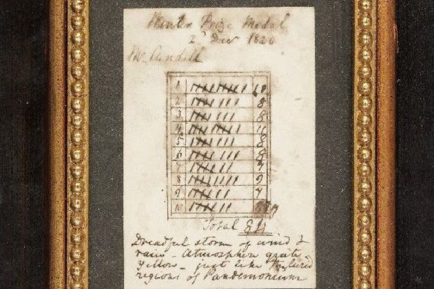 Kylfingurinn (Cundell) skrifaði athugasemdir sínar með rithönd sinni að neðanverðu á skorkortið en þar segir: “Dreadful storm of wind and rain — atmosphere quite yellow — just like the lurid regions of Pandemonium.”