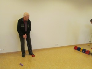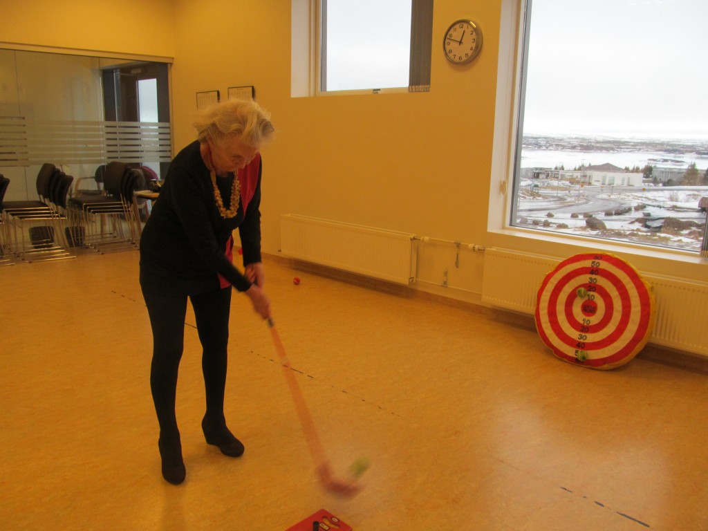 Þegar Golf1 var á staðnum var hin 85 ára Svava Gunnlaugsdóttir, frá Siglufirði að æfa bæði högg og pútt, undir handleiðslu leiðbeinandans Katrínar.