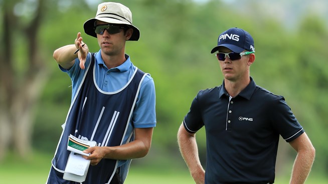 Þremenningarnir í 2. sætinu eru búnir að spila á samtals 14 undir pari, hver og því 3 höggum á eftir forystumanninum.