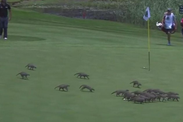Hópur manga hljóp yfir flöt í dag á Nedbank Golf Challenge á keppnisvelli Gary Player CC, í Sun City S-Afríku.