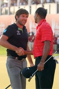 Robert Rock tekur í höndina á Tiger eftir sigurinn í Abu Dhabi í dag, 29. janúar 2012. Mynd: europeantour.com