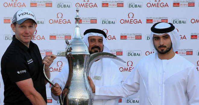 Sterne og Gallacher eru mestu máta. Hér takast þeir í hendur eftir lokahringinn á Omega Dubai Desert Classic.