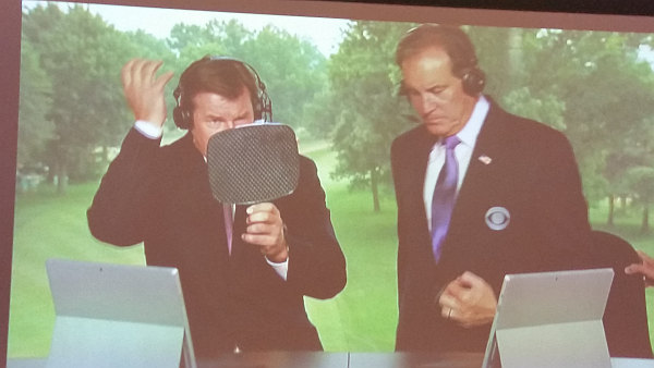 Það var úrhellisrigning og leikur tafðist aðeins á heimsmótinu, en meðan á töfinni stóð rann yfir risaskjá á WGC Bridgestone myndt af Nick Faldo þar sem hann var með risaspegil og að greiða sig rétt áður en hann færi í loftið á CBS.
