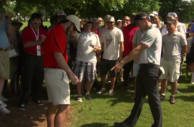 Þannig að það kom á óvart þegar hann sló teighögg sitt af 14. teig á East Lake, þar sem The Tour Championship fer fram, í vasa á áhorfanda.