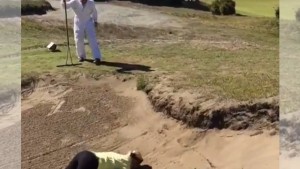 Það er alltaf eitthvað nýtt, sem kylfingar reyna að taka upp á. Eins og að reyna afturábak stökk í sandglompu á golfvelli. Eins og óheppinn kvenkylfingur nokkur reyndi …. með þeim afleiðingum að hún datt á andlitið. Það hefði e.t.v. verið nær að reyna að gera þetta í sundlaug en ekki við sandglompu! Hægt er að skoða ósköpin með því að SMELLA HÉR: