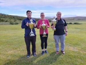 Meistaramót Golfklúbbsins Óss (GÓS) fór fram dagana 3. og 4. júlí sl. á Vatnahverfisvelli á Blönduósi í fínu veðri. Þátttakendur í ár voru 8 og léku þeir í 3 flokkum. Klúbbmeistarar GÓS 2020 eru þau Birna Sigfúsdóttir og Eyþór Franzon Wechner. Sjá má öll úrslit í meistaramóti GÓS í Golfboxinu með því að SMELLA HÉR: Eins má sjá öll úrslit hér að neðan: Meistaraflokkur karla. 1.sæti Eyþór Franzson Wechner, 30 yfir pari, 170 högg (85 85). 2.sæti Jón Jóhannsson, 35 yfir pari, 175 högg (89 86). 3.sæti Valgeir M Valgeirsson, 46 yfir pari, 186 högg (99 87). Meistaraflokkur kvenna. 1.sæti Birna Sigfúsdóttir,65 yfir pari, 205 högg (100 105). 2.sæti Jóhanna G Jónasdóttir, Lesa meira