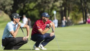 Það eru heimamennirnir Adri Arnaus og Rafa Cabrera Bello sem eru í forystu í hálfleik Mutuactivos Open de España. Báðir hafa samtals spilað á 11 undir pari, 131 höggi; Arnaus (65 66) og Bello (66 65). Einn í 3. sæti er enn einn spænski kylfingurinn Samuel del Val (samtals 10 undir pari) og í því 4. sömuleiðis Spánverjinn Jon Rahm (á samtals 9 undir pari). Sjá má stöðuna á Mutuactivos Open de España mótinu með því að SMELLA HÉR: Sjá má hápunkta 2. dags á Mutuactivos Open de España með því að SMELLA HÉR: Í aðalmyndaglugga: F.v.: Rafa og Adri.