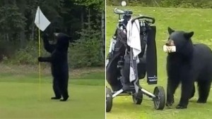 Dýr á golfvöllum: Skógarbjörn stelur sér samloku úr golfpoka!