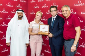 Fyrrum W-7 módelið finnska Minea Blomqvist hlaut handgert OMEGA úr, úr hendi Henri Burrus, sem er svæðisstjóri sölumála í Dubaí, að viðstöddum Mohamed Juma Buamaim, varaformanns og framkvæmdastjóra golfs í Dubaí og Ivan Khodabakhsh, framkvæmdastjóra LET. Minea fór holu í höggi á par-3 7. holuOmega Dubai Ladies Masters í Emirates golfklúbbnum í gær. Hún notaði 7-járnið sitt við höggið góða á holunni sem er 147 yarda (134 metra), en hún er aðeins 2. LET-kylfingurinn sem tekst að fá holu í höggi á holuna. Fyrsti LET-kylfingurinn til að fá ás á holunni var Tanía Elosegui frá Spáni, en Minea er síðan sú 6. í röðinni til að fá ás á holunni af öllum Lesa meira