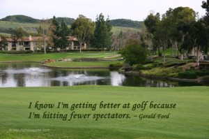 Le golf est un jeu facile, difficile à jouer . Inconnue „Golf er auðveldur leikur, sem erfitt er að spila.” Óþekktur. „I know I´m getting better at golf because I´m hitting fewer spectators.“ „Ég veit að mér fer fram í golfinu vegna þess að ég hitti færri áhorfendur.” Gerald Ford, 38. forseti Bandaríkjanna. “No golfer can ever become too good to practice.” May Hezlet „Enginn kylfingur verður of góður til að æfa.” May Hezlet “Grip it and rip it. It works for John Daly. It never worked for me. All I did was wear out golf gloves.” Chuck Stark, The Sun Link, June 17, 2003. Þrífðu og Lesa meira