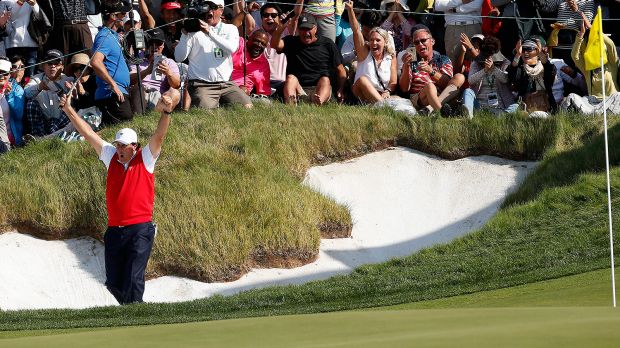Þannig náði hann að setja niður úr glompu fyrir fugli á par-3 13. holunni. Sjá með því að SMELLA HÉR: