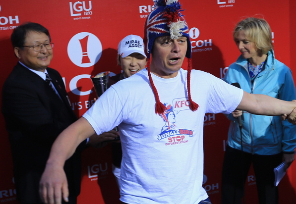 Honum hafði fyrr á árinu tekist að trufla verðlaunaafhendingu á Opna bandaríska þegar Webb Simpson fékk afhent verðlaun sín.