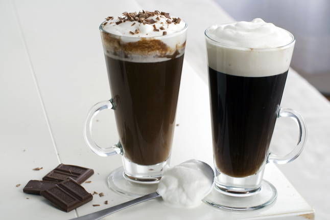 Fyllt upp með (18 cl) sterku heitu kaffi. Ekta handþeyttur rjómi settur ofan á (ekki tilbúinn rjómi úr sprautubrúsum) Kaffidufti og súkkulaðispænum stráð yfir. | |
