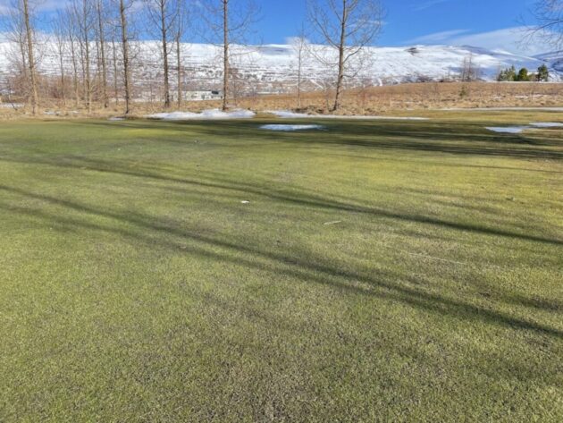 Hitastigið hefur verið hátt undanfarna daga á Akureyri þar sem að hlýir sunnan vindar hafa ráðið ríkjum. Sólin skein skært samhliða þessum miklu hlýindum. Starfsmenn GA hafa unnið hörðum höndum í vetur að létta á snjó og tryggja það að snjór og klaki fari af flötunum eins fljótt og mögulegt er. Í byrjun ársins 2021 snjóaði mikið á Akureyri og er veturinn fram til þessa einn sá allra snjóþyngsti í mörg ár.