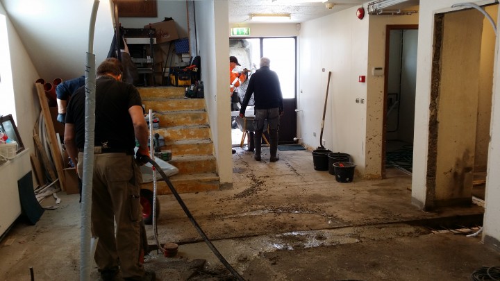 Framkvæmdir í kjallara ganga mjög vel, búið er að rífa niður gömlu geymsluna, saga hurðar í tvö veggi, leggja nýjar vatns og skólplagnir í golfið og nú í morgun var klárað að saga fyrir gólfhitalögnum í kjallaranum.