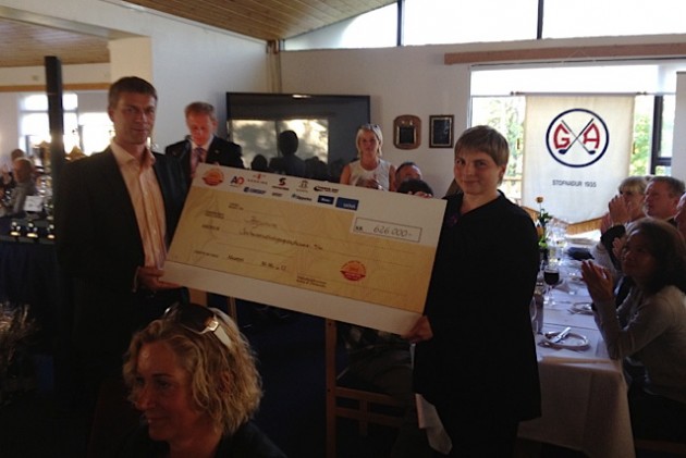 Á meðfylgjandi mynd afhendir Ómar Pétursson formaður Arctic Open nefndar Maríu Sigurðardóttur frá Hetjunum ávísunina.