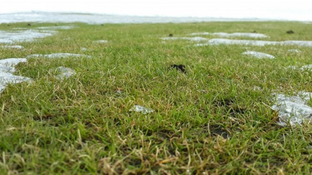 Staðan á flötunum upp á Jaðri er bara nokkuð góð.  Stærstur hluti flatanna lítur vel út undir klakanum og mikið af grænu sem kemur undan honum þegar hann er brotinn af.