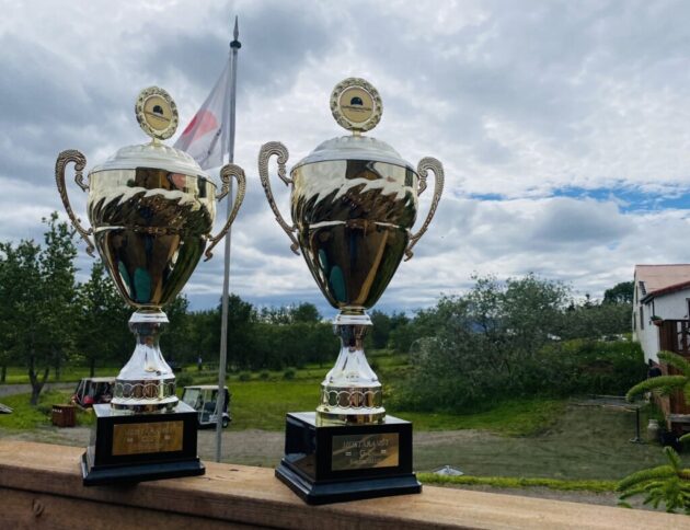 Í aðalmyndaglugga: klúbbmeistarabikararnir, sem keppt er um að Flúðum. Mynd: GF
