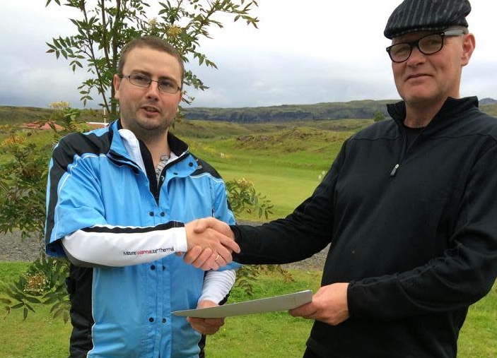 Eftir innanfélagsmót GHG 16. júlí s.l. afhenti gjaldkeri klúbbsins styrkinn til Björns Arons, sem er  klúbbfélagi í GHG, en hann er faðir Arons (sjá mynd).