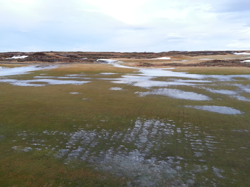 „Eins og félagar hafa vafalaust tekið eftir hefur ís og klaki sem lagst hefur á golfvöllinn okkar legið óvenju lengi, eða frá í desember.