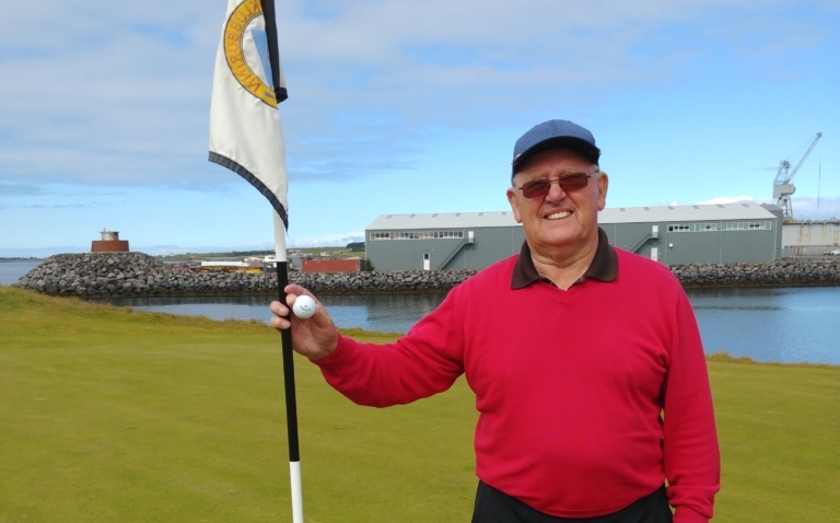 Örn Einarsson fór holu í höggi á 15. holu Hvaleyrarvallar, í gær, þriðjudaginn 28. júlí 2020.