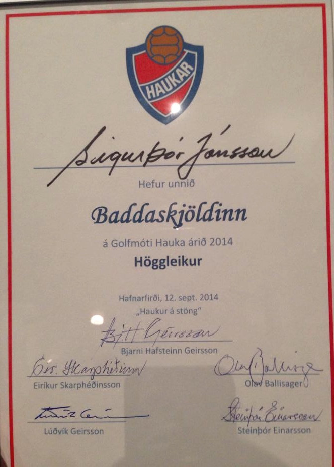 Föstudaginn 12. september s.l. var haldið hið árlega golfmót Hauka og voru 83 Haukamenn út um allan Hvaleyrarvöll að reyna við Baddaskjöldinn og Rauða jakkann. Veðurguðinn bauð uppá ekta haustveður, mikinn vind. Í þessu móti er keppt um Rauða Jakkann í punktakeppni og einnig titilinn Öldungameistari Hauka til minningar um Ólaf H. Ólafsson. Baddaskjöldinn hlýtur svo sá Haukamaður sem spilar best í höggleik en Rauði jakkinn fór til þess sem fékk flesta punkta. Fjöldi fólks var viðstatt verlaunaafhendingu sem fór fram í golfskálanum nú í kl 20:00 föstudagskvöldið. Glæsileg verðlaun voru veitt og var dregið úr skorkortum í lokinn. Golfklúbburinn Keilir og Haukar þakka öllum kærlega fyrir stuðninginn og skemmtilegt mót. Úrslit úr mótinu eru eftirfarandi: