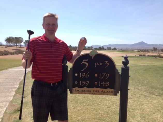 Ágúst Arnbjörnsson, flugstjóri og meðlimur í GKG, fór holu í höggi á 5. braut á Hacienda del Alamo. Ágúst er faðir Elísabetar, 16 ára, og var í foreldrahópi keppniskylfinga GKG, sem staddir voru þar í æfingaferð síðastliðna viku.