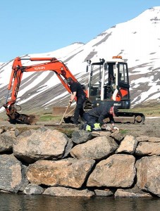 Edwin Roald, golfvallarhönnuður kemur ásamt Ármann Viðari Sigurðssyni, byggingarfulltrúa Fjallabyggðar, að endurskipulagningu á Leirutanga á Siglufirði.