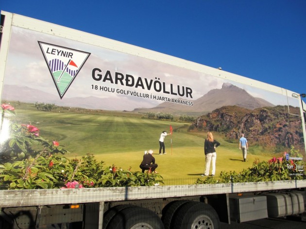 Á einni hlið vörubifreiðarinnar var gríðarstór og falleg auglýsing fyrir Garðavöll á Akranesi. Skemmtileg leið til að auglýsa golf og fallegan, góðan golfvöll sem Garðavöllur er!