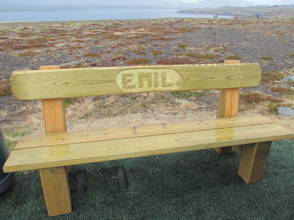 Við par-3 9. teig Hlíðarvallar stendur listilega útskorinn bekkur, þar sem á stendur: Emil.