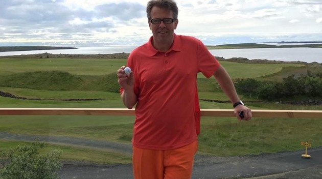 Þetta er líklega fyrsta skipti sem einhver fer holu í höggi á nýju 18. holunni á Hlíðavelli.