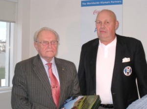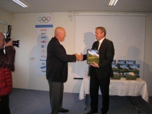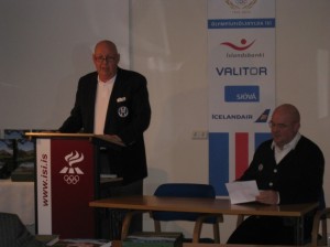 Jón Ásgeir, forseti GSÍ afhendir Ólafi Rafnssyni, forseta ÍSÍ, fyrsta eintakið af Golf á Íslandi! Mynd: Golf 1.