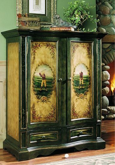 Svo má líka finna handmáluð húsgögn með ýmsum golfmyndum t.d. þennan antíkskáp: