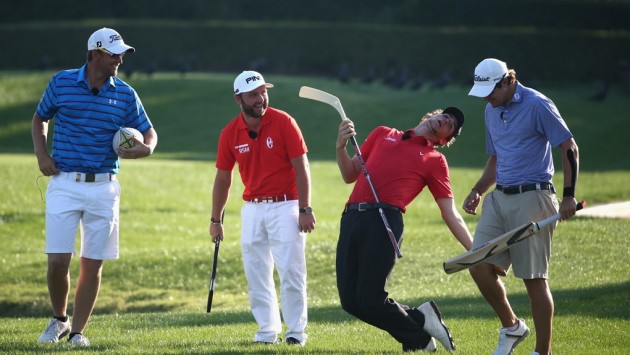 Í meðfylgjandi myndskeiði má sjá keppnina milli þessara fjögurra, þar sem þeir spila golfholu án þess að golfútbúnaður sé notaður.